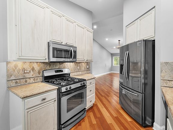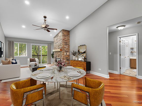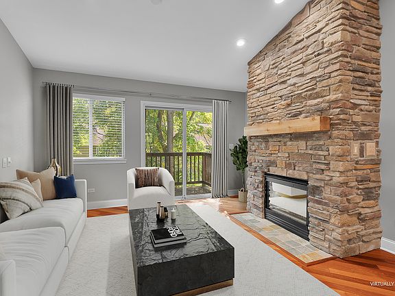 You Can't Miss This Hidden Gem at Oaks at Hidden Glen! This beautifully updated two-story townhome offers the perfect mix of modern style and natural serenity. Surrounded by lush greenery that feels like a forest escape, yet just minutes from expressways, Metra, shopping, and dining-you truly get the best of both worlds. Inside, the open-concept main level wows with soaring vaulted ceilings, sun-drenched spaces, and rich Brazilian cherry hardwood floors. A striking stone fireplace creates the ultimate cozy centerpiece, while the upgraded kitchen boasts 42" cabinets, granite countertops, stainless steel appliances, and a spacious island designed for entertaining or everyday living. The main floor also features two generous bedrooms and a full bath with a dual vanity. Downstairs, discover even more living space: a third bedroom, a full bath, and a newly refreshed laundry room with modern washer and dryer. Luxury vinyl plank flooring throughout the lower level adds both durability and a fresh, stylish touch. This home blends comfort, convenience, and character in a one-of-a-kind setting. Whether you're looking for your next sanctuary or an investment, you don't want to miss it!