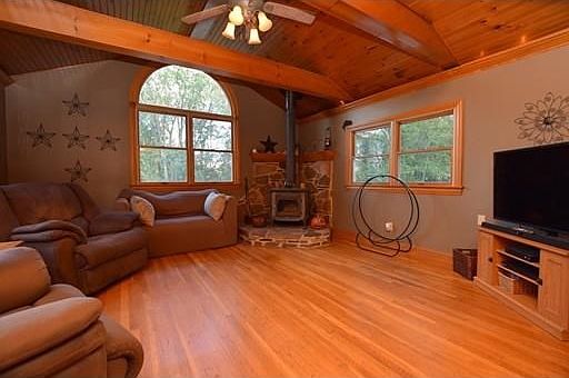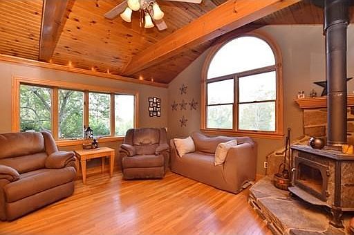 - Liv Dscrp: Flooring - Hardwood, Window(s) - Bay/Bow/Box, Ceiling - Cathedral, Open Floor Plan, Ceiling Fan(s), Ceiling - Beamed, Window(s) - Picture, Wood / Coal / Pellet Stove