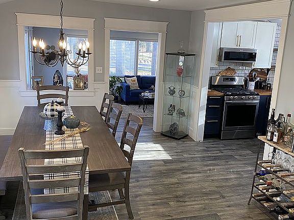 Dining Room: Large open dining room with pond views. Custom wainscoting. Elegant 8 bulb chandelier.