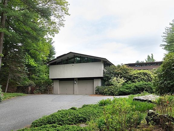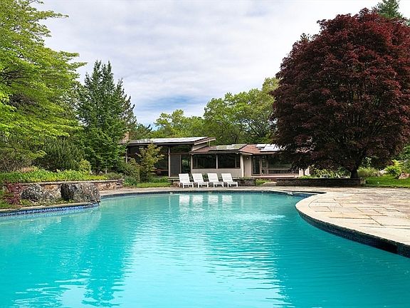 Located on a hilltop at the end of the Stonehedge cul-de-sac, this custom mid-century modern Deck House sits on 3+ private acres of professionally landscaped estate-like grounds. The dramatic living room features soaring ceilings, a fireplace, and floor-to-ceiling windows overlooking a bluestone terrace, an expansive pool, and a fenced yard. Natural-light-filled interiors and a flexible floor plan offering 4+ bedrooms and multiple office options. The primary suite has a spa-like bath with a shower, soaking tub, and radiant floor heating. The lower level includes a media room, gym/studio, and project room. Extraordinary storage throughout, a 2-car heated garage w/EV charger, + a garage-size shed. Robust systems: Buderus boiler, 400-amp electric, and 2013 solar PV array. The property spans 2 lots - one in Lincoln, one in Weston - with mature plantings, rock gardens, pergola, 2 sports courts, all abutting 100+ acres of conservation land. Enjoy the good life at this retreat-like property!