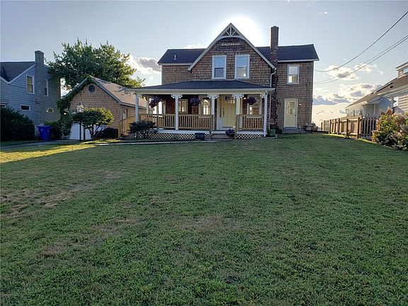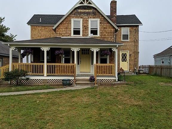 BIRCHBROW is one of the first 5 original homes that has graced the shores of Narragansett Terrace since the 1800's. This home encapsulates the true essence of New England living. As you enter the front door from the expansive farmers porch, the panoramic view of the water is second to none. Extra large living room with brick fireplace, hardwoods and open floor plan creates a feeling of both openness and comfort. Kitchen has new butcher block counters, flooring and new tile back splash. Cozy sitting room sits adjacent to the living room and allows you the beauty of the best westerly sunsets around. Mudroom/laundry area, second front door and 1/2 bath accompany the rooms on first floor. Original hardwood staircase takes you to the second floor area where hardwood foyers lead you to two secondary bedrooms, one water view and a water view master bedroom. A full bath with shower and tub is centrally located to all 3 bedrooms. With a huge front yard and driveway, newer garage and spectacular beachfront back yard, this home is a must see and will not last. Come enjoy Narragansett Terrace living.