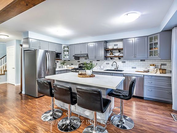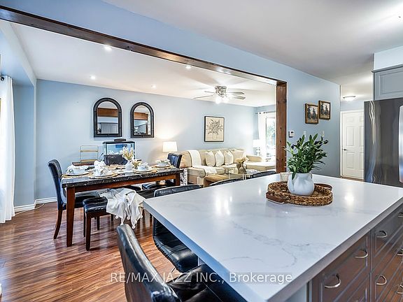 Nestled on a quiet crescent in Aspen Springs, West Bowmanville, this spacious (one of the largest linked models in the area) and thoughtfully updated 3-bedroom + BONUS ROOM (easily convertible to 4th bedroom), 2.5 bath , 2-storey home is cozy with modern upgrades. Located in a family-friendly neighborhood close to schools, shopping, HWYs, the home features a bright open-concept main floor with a beautifully renovated eat-in kitchen (2020) boasting quartz countertops, a large center island with breakfast bar, gas stove, and stainless steel appliances. The kitchen walks out to a fully fenced backyard and spacious deck - perfect for entertaining. The combined living and dining room offers a warm ambiance with a cozy fireplace. Upstairs, a standout feature is the large family room with a bay window, wood-burning fireplace, and accent wall - easily convertible into a 4th bedroom. The primary suite includes a walk-in closet and a newly remodeled ensuite (2024), complemented by two additional bright and spacious bedrooms. The finished basement adds additional space ideal for a rec room, office, or home gym. Recent updates include: kitchen (5 yrs), ensuite (2024), other bathrooms (3 yrs), deck (4 yrs), roof (1.5 yrs), and driveway resealed (2025). With its inviting layout and stylish finishes, this home offers comfort, flexibility, and room to grow. Hot water tank rented. Furnace and AC will be included. WETT certified.