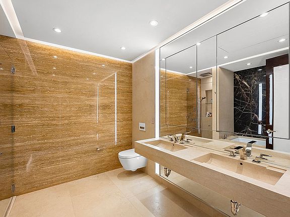 The primary suite offers serene sophistication with a custom walk-in closet and a spa-quality bathroom wrapped in Noir St. Laurent marble, Verona limestone, and Persian golden travertine. Indulge in a Lefroy Brooks soaking tub, radiant heated floors, and a floating double vanity for a true five-star experience.