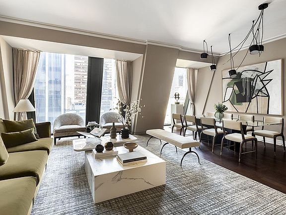 Balancing grand scale living with the intimate feeling of home, Residence 20B at 53 West 53 comprises 2,104 square feet, offering two split bedrooms, two-and-a-half bathrooms, and north-, east-, and south-facing exposures. Gracious proportions and ceilings ranging up to approximately 10'3" set the awe-inspiring stage for world-renowned designer Thierry Despont's masterfully conceived interiors. Bespoke detailing typically reserved for privately commissioned homes abounds, while a rich yet soft palette of museum-quality finishes imbues each space with both modern glamour and timeless elegance.