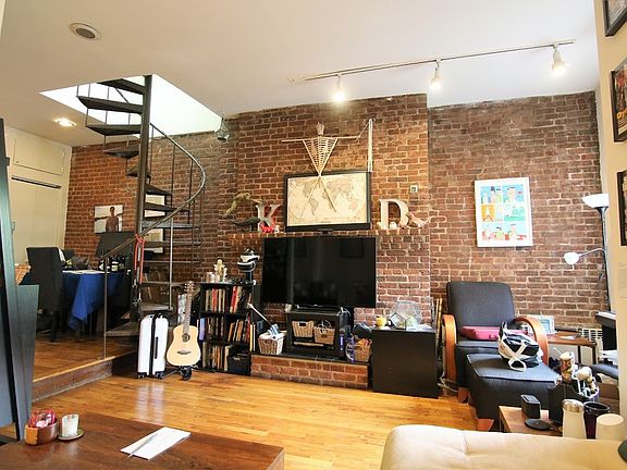 Sprawling Sunken Living Room with Exposed Red Brick Wall and Decorative Fireplace Boasts True UWS Charm