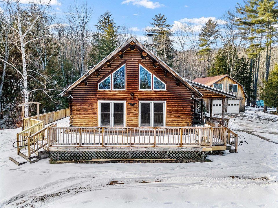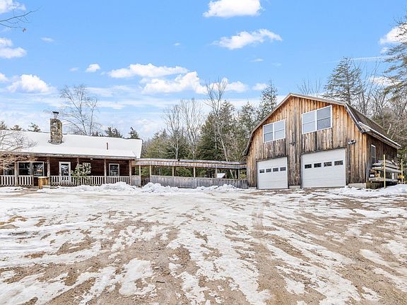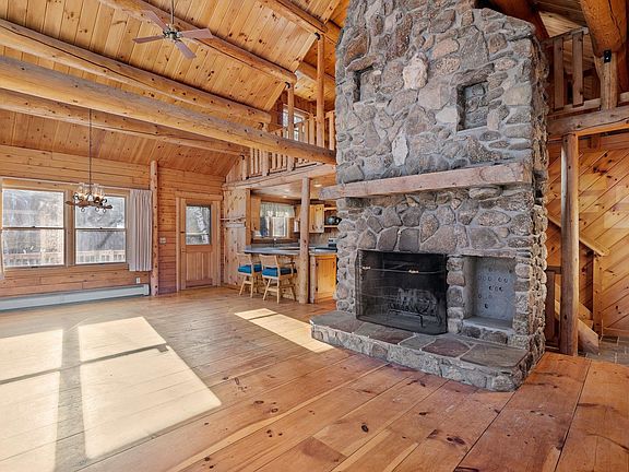 Positioned beautifully on 6+ private acres of land this log lodge makes for the perfect home in the woods. The sunlight floods into the cathedral living space as you enjoy the beautiful floor to ceiling fieldstone fireplace. Wide pine wood floors flow throughout the first level of the home from the living room into the large bright first floor bedroom. Bright and open with slider doors to the back deck this bedroom has plenty of light to highlight all of the pine woodwork of this home. The kitchen opens perfectly into the living and dining space to ensure all are included in every minute of enjoyment. Making for a great office space, the second floor loft opens to the living space below. The second floor bedroom is accompanied by a private ¾ bath ensuite. To ensure you have all of the living space you could need the lower level walkout is finished as a large family room including a wet bar. The detached 27x26, 2 car garage makes a fantastic hobby shop with room for your toys. The second story of the garage provides plenty of storage space. This property is located perfectly in the region to enjoy year round. You will find yourself 10 minutes to Wellington State Beach on shores Newfound Lake for summer fun or hit the slopes in the winter at Ragged Mounting in less than 20 minutes.