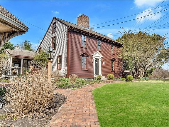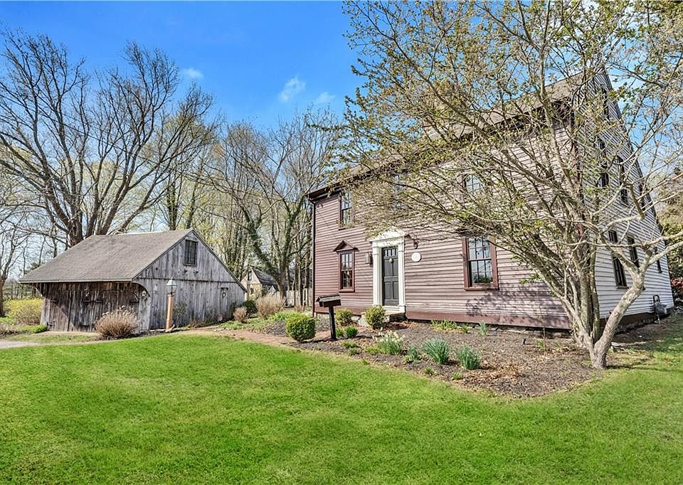 Built in 1775 by William Brown, this charming saltbox Colonial is designated by Barrington Preservation Society plaque as the Deacon Kent Brown home. Kent Brown, who was a shoemaker and Deacon of the Barrington Congregational Church, purchased the home in 1790 from his father, William. Sited on a one-acre lot, the craftsmanship of this multi-generational homestead showcases its history: beamed ceilings, wide-plank floors, custom built-ins and mantlepieces. The 1800 s.f. of living space includes two bedrooms plus bonus room, one full bath, and one ¾ bath (this one has only a tub but no shower; it could easily be converted into a shower). The roof and windows were replaced in 2010, and a new gas heating system was installed in 2015. The detached two-car garage has heated loft space above, perfect for home office or gym and current zoning presents the possibility to build another residence on the lot. Being located across from Hundred Acre Cove there is easy access to kayaking or canoeing and is in close proximity to the schools, shops and restaurants of Barrington, yet just a short commute to Providence, this historic home is perfectly positioned to welcome its next steward.