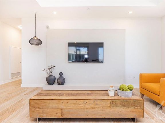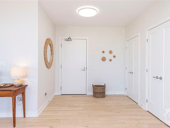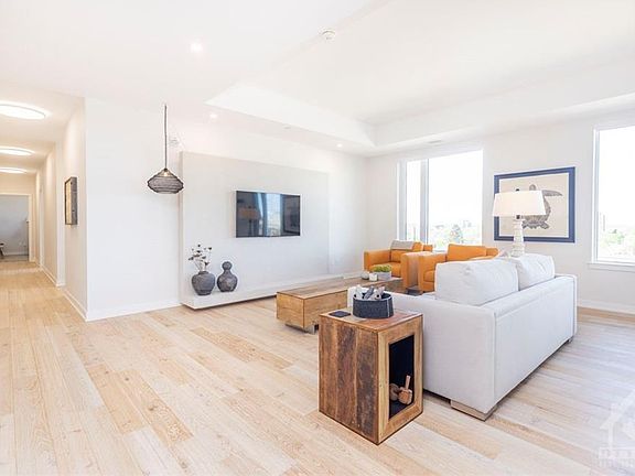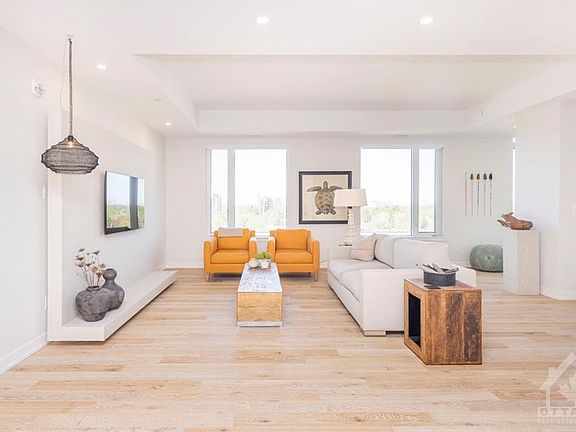 This exclusive penthouse condo offers panoramic views of our Nation's Capital, in one of Ottawa's waterfront communities, The River Terraces. Crafted by eQ Homes, this stunning penthouse offers a breathtaking layout. Two penthouses merged together creating 2368 sq ft* of interior space plus 281 sq ft between the 2 balconies. Featuring 3 bedrooms, 2.5 baths, luxury finishes and smart home systems throughout. A welcoming foyer leads you to a grand open concept living & dining room, featuring a Roman clay wall mount in the living room that leaves you with a feeling of calm. A sleek modern kitchen offering quartz counters, backsplash, high end appliances, walk-in pantry for additional storage. A balcony off the kitchen, ideal for your morning coffee with views of downtown/River. The primary bedroom offers a second balcony with views of TD Place & beautiful sunsets. A serene space with 2 walk-in closets and ensuite. Complete with 2 spacious bedrooms and separate laundry room. *as/per build 2022-11-07