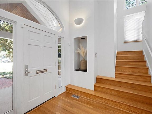 A Rare Historic Oakwood Opportunity! This one-of-a-kind residence—designed by a prominent local architect as his personal home—has been celebrated in Better Homes & Gardens Building Ideas (Winter 1990) and NC Home (April 1992). Thoughtfully crafted to harmonize with the historic fabric of Oakwood, it pairs contemporary design with timeless character. Set well back from the street, the home offers a welcoming brick driveway and walkway surrounded by natural landscaping, creating generous front-yard space for gatherings or play. Step inside the dramatic two-story foyer, where warm cedar tongue-and-groove ceilings meet bold white angular walls, setting the stage for an inspired interior. The family room features soaring floor-to-ceiling windows, a coffered ceiling, and a striking gas fireplace framed by glass block and black marble. Just beyond, a private retreat opens to a side courtyard—ideal for a home office, playroom, or studio. The gourmet kitchen is equipped with quartz counters, gas range, Sub-Zero refrigerator, and abundant cabinetry, flowing seamlessly into a light-filled dining room with bay windows and stylish pendant lighting. Upstairs, the owner's suite impresses with vaulted cedar ceilings, dual closets, and an updated spa-like bath with walk-in shower and dual vanities. Two additional bedrooms, a full bath, and convenient laundry complete the second floor. Throughout, built-in bookcases, cabinetry, and lighted niches offer elegant display and storage solutions. Don't miss the versatile purpose room—perfect for fitness, office, or creative space—tucked on the exterior left side of the home. Outdoor living shines with a private courtyard and landscaped backyard designed to be enjoyed from the home's many windows. A fenced yard and storage shed add everyday convenience.
