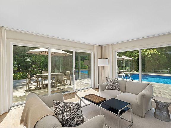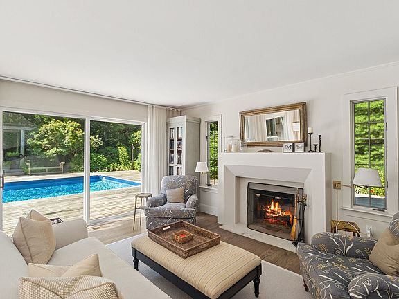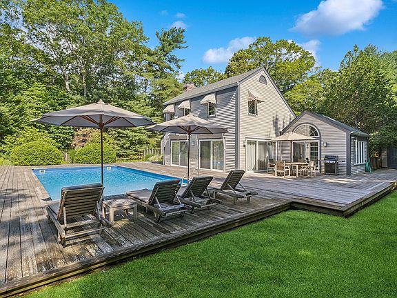 Set on 2.26+\- private acres close to both East Hampton and Sag Harbor Villages, this three-bedroom traditional offers the perfect blend of comfort, style, and indoor-outdoor living across 2,100+\- sf of living space. Thoughtfully designed for entertaining and relaxation, the home features a spacious living room with two sitting areas and a wood-burning fireplace. Multiple sets of glass sliders flood the space with natural light and lead to an expansive deck, where lounge and dining areas surround the pool, creating a true outdoor oasis. The kitchen is equipped with integrated refrigeration and modern updates, making it as functional as it is attractive. With three bedrooms and two and a half bathrooms currently, there's potential to expand the existing 1st and 2nd levels to 7,000 sf in addition to finishing the lower level. A detached two-car garage offers additional convenience, while the peaceful setting ensures privacy without sacrificing proximity to the best of the Hamptons.