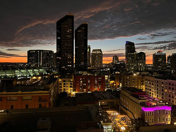 Live above it all in this furnished top-floor studio (that presents like a junior 1 bedroom) with sunset views in the heart of San Diego's Gaslamp Quarter. This top-level west-facing end-unit boasts a private balcony overlooking the harbor, Coronado, and iconic Gaslamp Sign. Enjoy a thoughtfully designed layout with high ceilings and modern furnishings, in-unit laundry, central A/C, and secured garage parking. The building offers premium amenities including a gym, BBQ courtyard, package lockers, and private security. Walk to Petco Park, the Convention Center, Seaport Village, and San Diego's best restaurants and nightlife all just steps from your door. Utilities and Wi-Fi included.