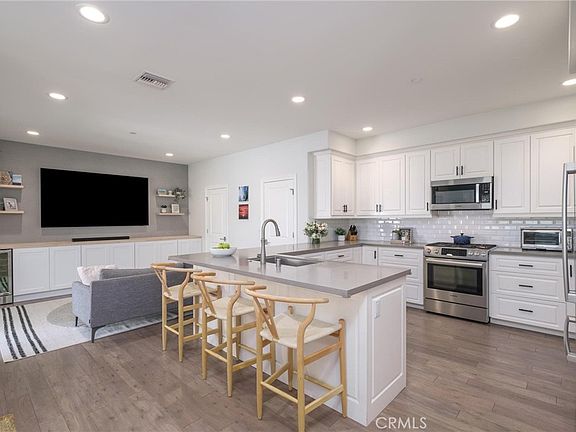 Inside, an expansive, sun-filled open floor plan flows to each room, perfect for both family relaxation or entertaining. Featuring two spacious living areas, a cozy fireplace, custom wall paper, and elegant designer touches. The kitchen and living flows to a private turfed back patio, perfect for entertaining and watching your favorite games on the outdoor TV.