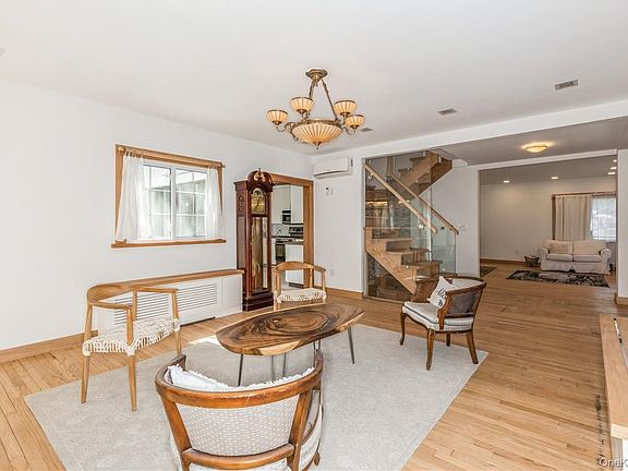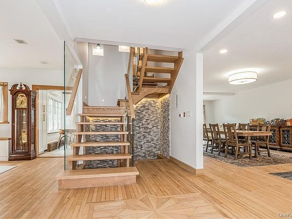 Spectacular, spacious, and sun-filled Tudor-style home featuring 4 bedrooms and 2.5 baths, set on a beautifully landscaped lot with a circular paver driveway in the award-winning Pearl River School District. This stately home combines classic architecture with contemporary updates, beginning with an impressive 9-foot entry door framed by glass side panels. Inside, gleaming hardwood floors and an open floor plan connect the banquet-sized dining/family room, with French doors to the deck, for an easy flow between indoor and outdoor living. The formal living room with gas fireplace, and a fully equipped eat-in kitchen, complete with stainless steel appliances, quartz countertops, and access to the backyard for summer BBQs, make entertaining a breeze. A stylish powder room and an abundance of custom cabinetry complete the main level. A striking stacked-stone wall and floating staircase lead to the second level, which offers four bedrooms, three with private balconies, and two full baths. The lower level provides ample storage and a convenient laundry area. Enjoy all that pedestrian-friendly Pearl River has to offer, including superb restaurants, shops, and an easy commute to Westchester, NYC, and New Jersey.