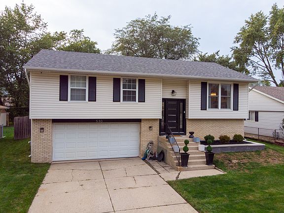 This home boasts an inviting open-concept floor plan featuring three bedrooms and two full bathrooms. Throughout the main floor, you'll find high-end chandeliers adding an elegant touch to every room. The kitchen stands out as the highlight of the house, showcasing brand-new fixtures and a stunning waterfall quartz island. The floors feature a contemporary neutral finish and are crafted from real hardwood. Modern wainscoting accents the main living area, enhancing its charm. The lower level surprises with a generously sized family room complete with a full bath and convenient laundry facilities. The front door makes a bold statement, setting the tone for the entire home.Downstairs, a modern mantle and fireplace in the basement perfectly complement the newly installed dry bar. And don't miss the 24-foot pool, partially encased with a walk-up deck, complete with a brand-new liner and filter. This home offers a blend of modern elegance and comfort for your family to enjoy. Outside, you'll find a two-tier deck with an above-ground pool in a semi-private fenced yard. The spacious two-car garage includes a new, ultra-quiet garage door opener.