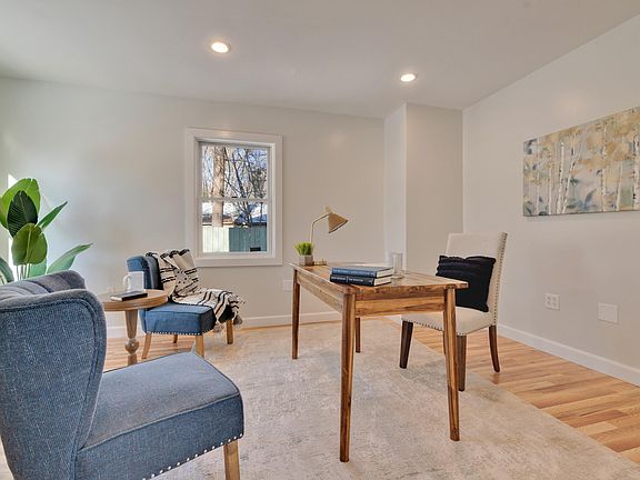The first floor features an open-concept living and dining area, a versatile space perfect for a home office, and a full bath. Upstairs, you'll find a spacious hallway landing leading to two bedrooms and another full bath.