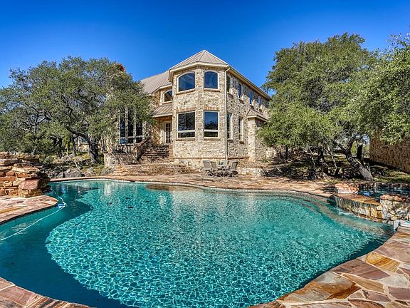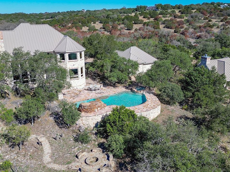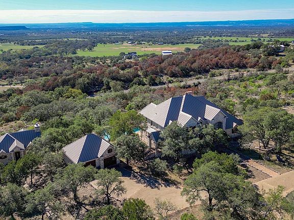Hello views!! Nestled in the Texas Hill Country and overlooking your gorgeous 13.03 acres. The main residence & guest house both exude a casual yet elegant lifestyle. The professional Viking kitchen appliances will impress any chef and the grand stone fireplaces are found throughout the home & guesthouse. The breakfast & living area have exposed, aged beams and spectacular views. The primary bedroom is private and luxurious with its own rock and brick fireplace as well as a huge walk-in closet with built-ins. The additional bedrooms are charming and inviting. Outside, you’ll find a heated in ground pool and hot tub w/custom rock work. The bonus guesthouse is spacious and private, and ready to be enjoyed. The outside firepit is steps away from the home and pool. This home comes completely furnished with high-quality furnishings and linens. This property is in the prestigious Cavern Ranches Estates. Private secure front gate welcomes you home. Seller was a renowned stone mason so you'll find his work displayed beautifully throughout.