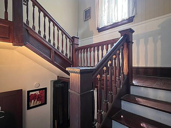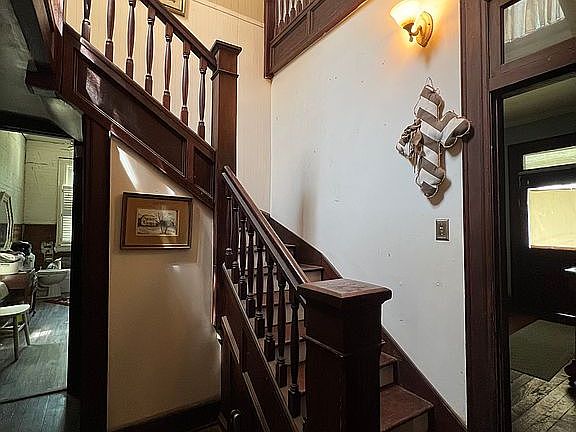 This stately home is located just outside the city limits on a 0.08 acre lot with matured trees and a picturesque setting. Main floor features living room, study, eat-in kitchen, dining room, bedroom, bathroom, and utility area. A beautiful period staircase leads upstairs to three bedrooms. Recently restored with new vinyl siding and new roof. The house has beautiful wood throughout.