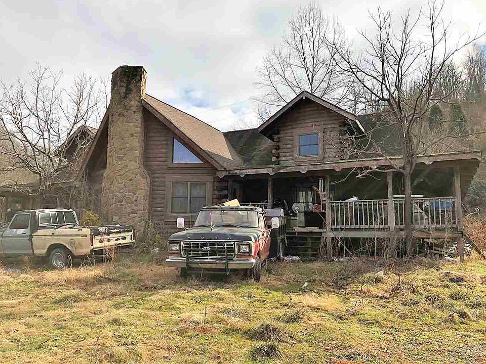 Local stone used in Chimney inside and out. Hemlock log, Locust Hardwood Flooring also known as Appalachian Gold.