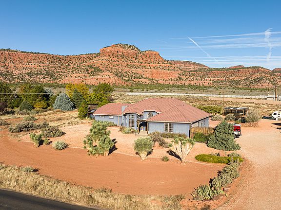 Horse property within Kanab City Limits with room to grow! This spacious single story home offers four bedrooms and two bathrooms. One bathroom was recently completely remodeled with a walk-in shower. The open-concept living room facing south invites plenty of sunlight to create a warm, welcoming atmosphere. Enjoy stunning views from the kitchen window to the north, making cooking a delight. The front yard is primarily Xeriscaped, while the backyard is a hidden gem, showcasing beautiful Mimosa trees that bloom with stunning flowers. Explore the serene backyard where you can walk and enjoy expansive views of the Red Rock cliffs. The property offers plenty of room for horses or other livestock, or room for another dwelling unit! Additional features include three storage sheds and a generator. Brand new HVAC system! Short term rentals allowed! (Buyer to verify all)