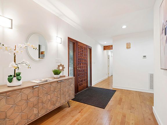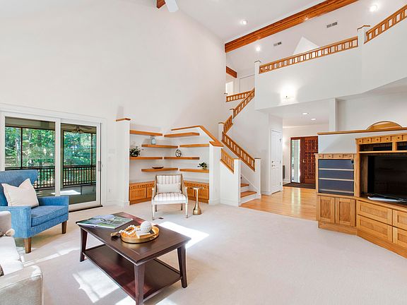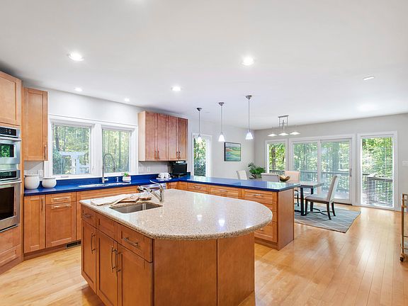 Built in 2001 by the Acorn Deck House Company, this custom post-and-beam home stands out for its precision engineering and timeless design. Unlike traditional site-built homes, it was prefabricated in sections within a climate-controlled facility and assembled on-site for superior accuracy. The panelized exterior wall system provides enhanced structural stability with double-stud edges, while hurricane clips reinforce the roof system for added durability. Inside, exposed beams and expansive glass panels create open, light-filled spaces that connect seamlessly with the outdoors. The fully finished walkout basement extends the living area and offers direct access to the backyard. Notable features include a remodeled primary suite with heated bathroom flooring, soaker tub, and custom closet; a 7-speaker surround-sound home theater with sub-woofer and ceiling-mounted projector; and a Kinetico water-softening system. Each floor has its own dedicated heat-pump HVAC system, including a split-zone setup for the bedroom level. The Meranti wood decking and signature wood front door add warmth and architectural charm, while recently upgraded garage doors enhance curb appeal. A rare blend of craftsmanship, stability, and comfort — built to last and designed to inspire.