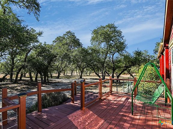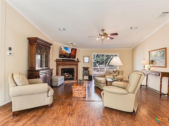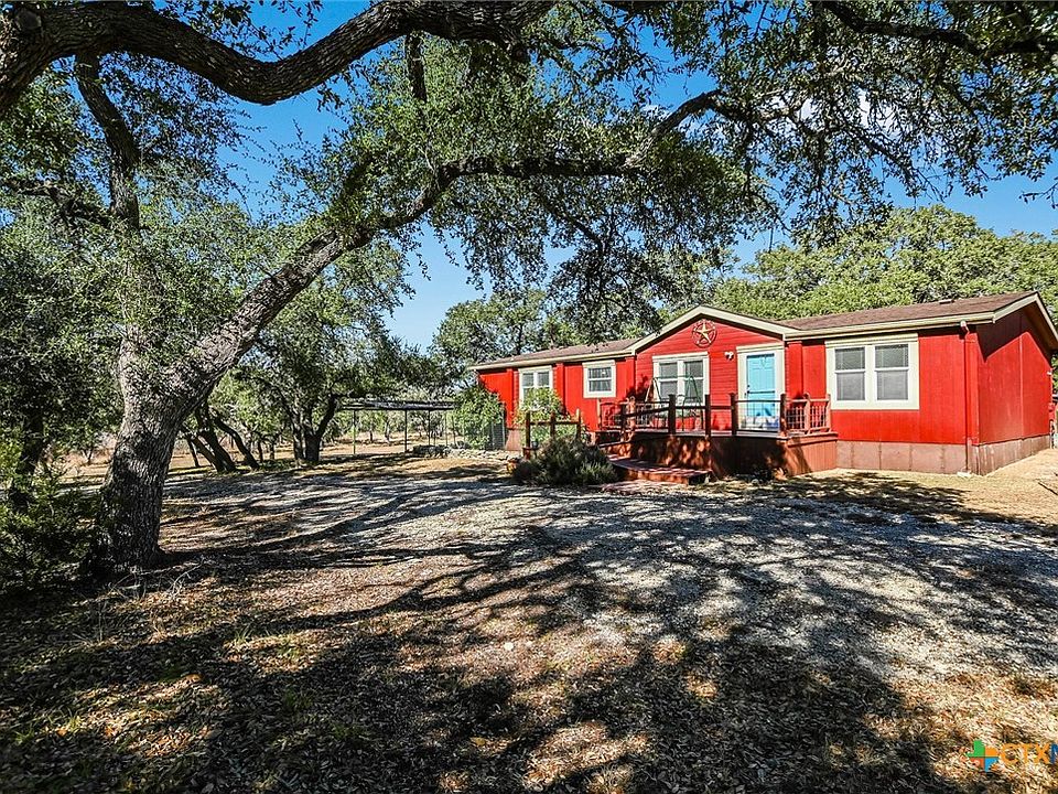 Nicely maintained manufactured home nestled among mature oak trees on 5.79 fully fenced acres. This inviting 3-bed, 2-bath home offers an open-concept layout with a spacious kitchen featuring a center island, gas range, built-in desk, and a sunny eat-in dining area. The living and formal dining rooms showcase peaceful views of the oaks and include a cozy wood-burning fireplace. Enjoy outdoor living on both the front and back decks. Additional features include a laundry room, a detached 2-car carport, and a large metal shop situated toward the back of the property—ideal for storage, hobbies, or workspace. The property also includes a small (currently dry) pond, hot tub on back deck, a fenced backyard, and a garden area. Experience quiet, scenic Hill Country living just minutes from town.