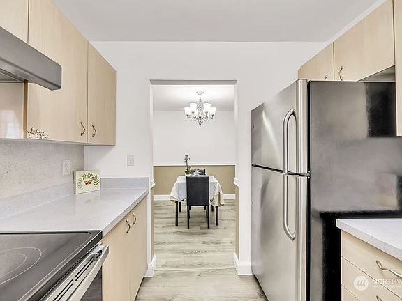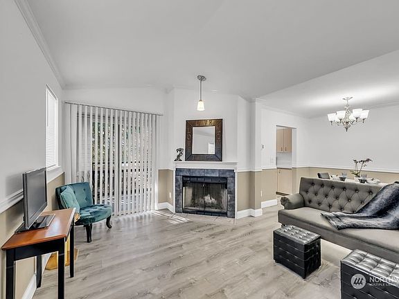 Top Floor End Unit with Low HOA dues and 2 dedicated parking stalls #130 & 174. Perfect for first-time buyer or investor – NO Rental Cap! Updated kitchen with new cooktop/oven, interior painting of cabinets, and window looking out to the back. Laminate flooring throughout except bedroom with carpet & bath has tile. Entry with tray ceiling, vaulted living area with wood fireplace opens to dining area and kitchen. Private covered back deck. Updated full bath w/tile floors. Bedroom has ceiling fan/light. Newer full-size washer & dryer stay. Sidewalk from condominium all the way to local shopping center. Easy access to ferry terminal, golfing, beaches, Boeing, freeways, schools, and local amenities. Nice club house & outdoor pool.