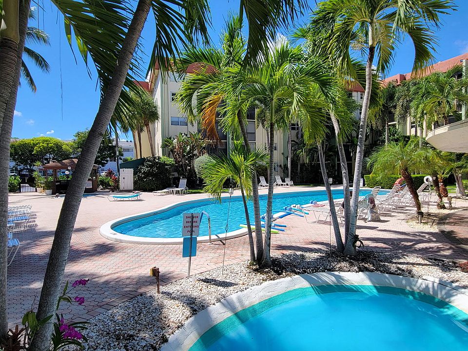 Welcome home to the resort style living FIRST FLOOR condo in East Fort Lauderdale, located just minutes from the beach. This 2 bed 2 bath property is move in condition, with updated bathrooms and a beautiful view of the courtyard with sounds of the waterfall! Walk right out the back patio and be a few short steps from the pool, gym, and walk up bar. You have everything you will need in the centralized location in this complex.