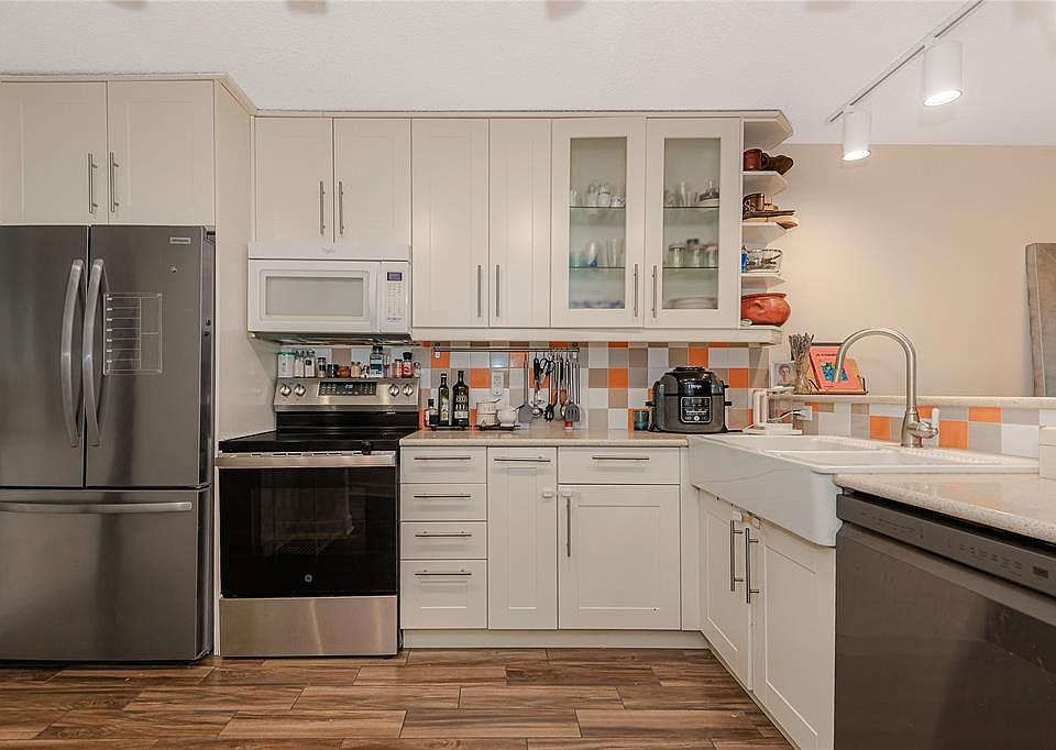 This sun-drenched top floor was just updated with new impact windows and door for safety and energy efficiency. All utilities are included in the maintenance fee, except electricity bill. Elevate your lifestyle with a stunning open kitchen with tons of counter space for prepping and hosting. Enjoy the peace of having no upstairs neighbors and a screened in balcony overlooking the tropical garden area. Laundry room is located immediately adjacent to the unit for maximum convenience. The meticulously maintained courtyard delivers an immediate tropical feel, complete with lush landscaping, colorful blooms, tranquil water features, pool, hot tub and waterfall.