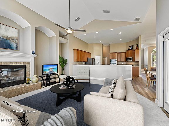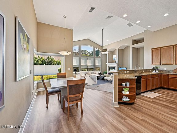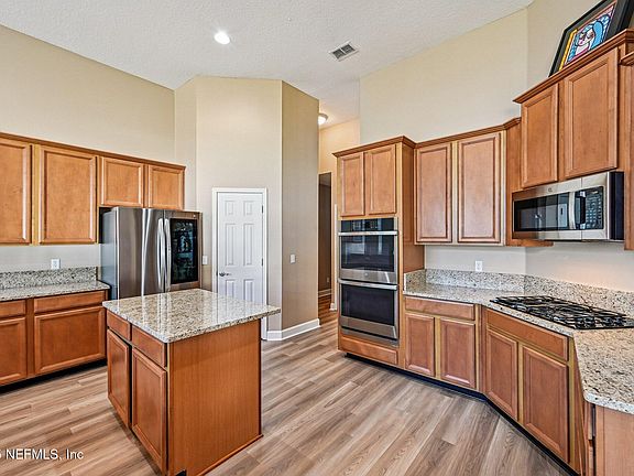 Welcome home to this expansive Cimarrone corner residence on a quiet cul-de-sac. Located in the highly rated St. Johns County School District, this home is close to the rapidly expanding restaurant and retail options in NW St. Johns County. As you enter this spacious home, the first thing you will notice are the towering 12' ceilings and its open floor plan. As you move through the property, you find an airy kitchen that features an island, double ovens and gas range! This room opens to the large and inviting family room. The living space flows nicely with luxury vinyl plank flooring. The master bedroom has tray ceilings and French doors that open to the covered lanai. The layout also features a Jack n Jill setup, ideal for children or guests. Additionally, the house has an office, which can be converted to a 4th bedroom and a