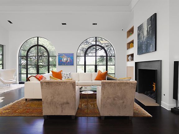 Limestone fireplaceSleek fireplacePrivate balconyGated neighborhoodFloor-to-ceiling glassSteel-framed windowsDramatic skylight