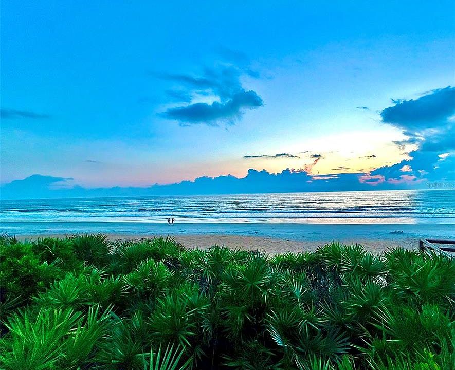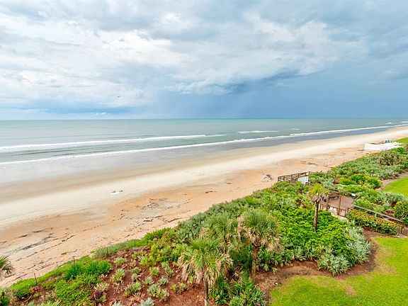 Imagine waking up each morning to the soft hues of sunrise over the Atlantic Ocean, visible from your wrap-around balcony in this beautiful 2-bedroom, 2-bathroom, direct oceanfront condo. Located on the coveted No Drive Beach of South New Smyrna, this unit offers panoramic views of miles of pristine coastline. The interior has been thoughtfully furnished with a coastal design and an open-concept living area drenched in natural light. The primary suite offers a serene retreat with a king-size bed, a large ocean-viewing window, and an elegant en-suite primary bathroom. A spacious guest bedroom and guest bathroom provide comfort and convenience for visitors. The unit also includes a stackable washer and dryer and features neutral tile and luxury vinyl plank flooring with carpet in bedrooms to complete this retreat home. Shorehom By The Sea, renowned for its rental zoning, has recently undergone extensive renovations, including newly restored balconies, and hurricane-rated windows, sliders, and doors, making this complex one of the most updated in New Smyrna Beach. All assessments have already been paid. Additional amenities include a walk-in closet in the primary bedroom, an owner closet within the condo, a large shared storage area on the 5th floor, a gas grill for the complex, multiple outdoor showers, and new restrooms in the pool area. Residents also benefit from a full-time property manager on-site. As a resident, you'll enjoy private beach access, a heated pool for year-round enjoyment, and the peace of mind that comes with a meticulously maintained property. Located minutes from the vibrant dining and shopping experiences of Flagler Avenue and Canal Street, and just a short drive from Canaveral National Seashore, this condo offers the perfect blend of luxury, convenience, and potential for lucrative rental income. Don't miss your chance to own a piece of paradise; this stunning beachfront retreat won't last long.