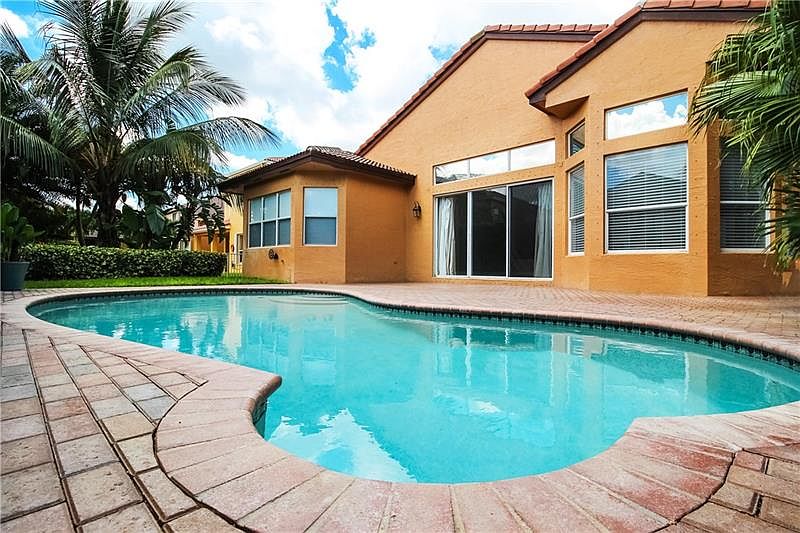 Beautiful 5bed/3 bath one story pool house in Sunset Lakes. This house features a triple split bedroom floorplan with excellent natural lighting. Wood laminate floors in all bedrooms, tile in all main areas, Volume ceilings throughout. Updated lighting and fans in bedrooms. Huge kitchen with large breakfast area, snack bar, extra storage, newer SS double door refrigerator, microwave & dishwasher. Updated baths. Completely private backyard & saltwater pool. Lush landscaping professionally maintained.