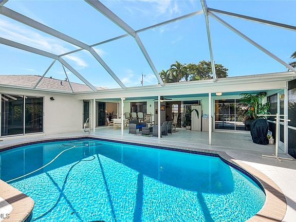 DIRECT GULF ACCESS POOL HOME IN THE HEART OF SW CAPE—NO LOCKS OR BRIDGES! Set on a quiet cul-de-sac and wrapped in lush, mature landscaping, this beautifully updated waterfront home delivers exceptional privacy, comfort, and effortless boating, offering deep water access with a 10,000-lb lift featuring brand-new motors (2025), a wraparound dock, and two davits for jet skis—all just a scenic 15-minute ride to open water. Inside, the light-filled layout showcases luxury vinyl plank flooring (2023), fresh interior paint (2023), and inviting architectural details including vaulted ceilings with exposed beams, skylights, and a custom artisan fireplace that anchors the living space with coastal charm. The remodeled kitchen features white shaker cabinetry, quartz countertops, stainless steel appliances (2024), reverse-osmosis filtration (2023), and a generous pass-through window for easy entertaining. Nearly every room opens to the expansive lanai where an oversized saltwater pool—resurfaced in 2023—sits beneath a new “no-see-um” cage (2023) with upgraded lighting, multiple seating zones, and exceptionally private sightlines created by tall palms, dense tropical plantings, and a strategic landscape design that shields the pool and lanai from neighboring views, clothing optional! The primary suite offers pool views, lanai access, and a beautifully updated bath with dual sinks, quartz counters, modern fixtures, and nautical-inspired lighting, while the guest wing includes a renovated pool bath with a custom marble shower (2023) and spacious guest rooms, one with direct pool access. Major upgrades include new HVAC and ductwork (2023), new plumbing system (2023), resealed lanai and pool deck (2024), new 50-gallon water heater (2023), new pedestal washer/dryer (2023), new paver driveway (2022), new pool vacuum (2023), and a durable 25-year shingle roof (2017). Outside, a charming bird path with arched trellises and shaded seating areas enhances the peaceful canal setting, all just minutes from Tarpon Point, Cape Harbour, kayak rentals, and a relaxing 10-minute bike ride to Rotary Park. Flood insurance is fully paid through February 2026 and transferable. This move-in-ready home offers a uniquely private tropical retreat with exceptional boating access in one of SW Cape Coral’s most desirable neighborhoods. Are you looking for a home with modern updates and premium boating access and ALL the updates inside and out? Come see this one! You deserve to be close to everything that SWFL has to offer: boat, kayak, jet ski, fish; or take a dip in your private oasis!