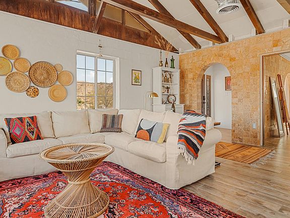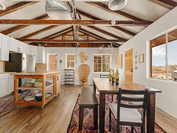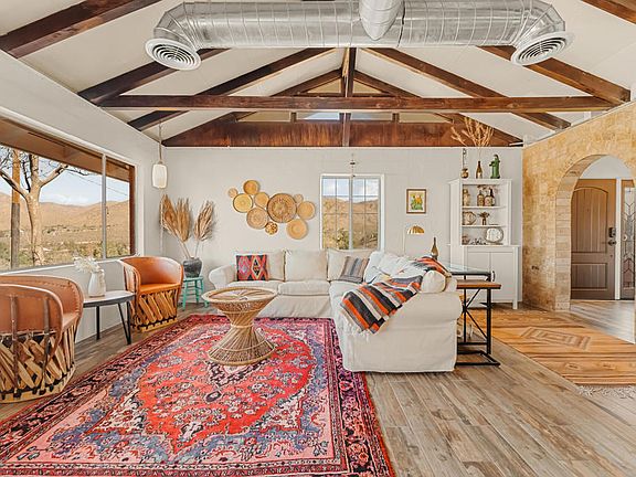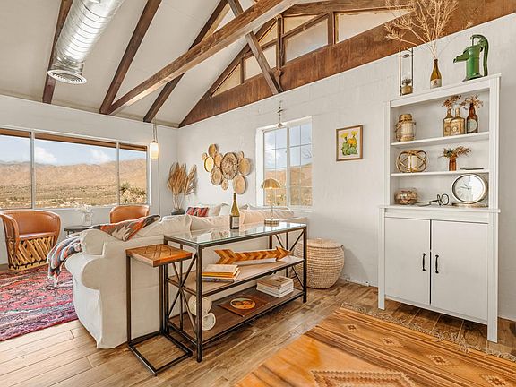 Views, views, views! Nestled atop 5 acres on a pristine desert mountainside, this charming pink homestead boasts panoramic views of Morongo Valley and beyond. There's simply nothing like golden hour in one of the soaking tubs or on the patio, where you can catch a glimpse of both San Gorgonio and San Jacinto in the distance. For the last year, this private oasis has been a 4.9-star Airbnb with dozens of glowing reviews about its ''secluded'' feel at an elevation that offers spectacular opportunities for sunset drinks and stargazing - plus sprawling acreage blanketed in desert flora and fauna.Located at the perfect midway point between Palm Springs and Joshua Tree, The Desert Lookout features an expansive living and dining room with vaulted ceilings and picture windows that perfectly frame the stunning views. There's plenty of cabinet storage in the kitchen, which has a custom wood island for extra dishes and a dual-unit HVAC system. The massive primary bedroom is multi-use and currently features a dedicated workspace and desk as well as its own sun-drenched meditation room with a built-in Murphy bed. It's cooled by a remote-controlled mini split. The ensuite bathroom has a shower, tub and double sinks. A front door smart lock makes arrivals and departures a breeze, and an extensive filtration system is available for the onsite well. Seller willing to consider offers inclusive of furnishings.