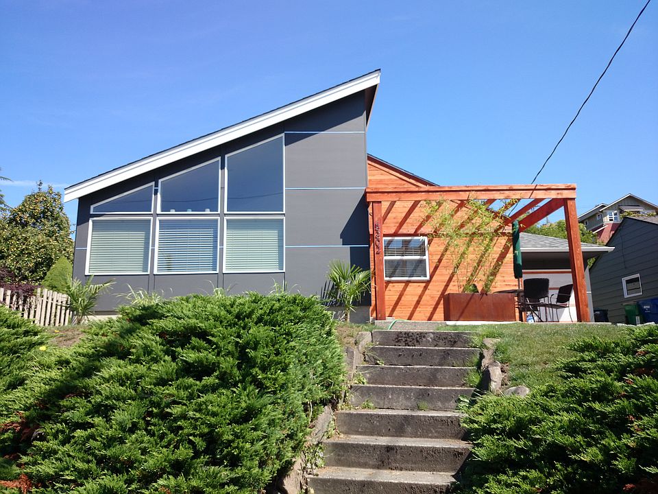Contemporary home remodeled in 2016 with updated bathrooms and office. This stately 3 bedroom home sits proudly above the street level. Freshly painted interior / exterior, new architectural roof, stained oak hardwood floors and polished concrete in new vaulted ceiling Living room. Attached garage with extended driveway for additional parking is a bonus, also provides easy access to the side door. Spacious rear yard, gas furnace, & vinyl windows.