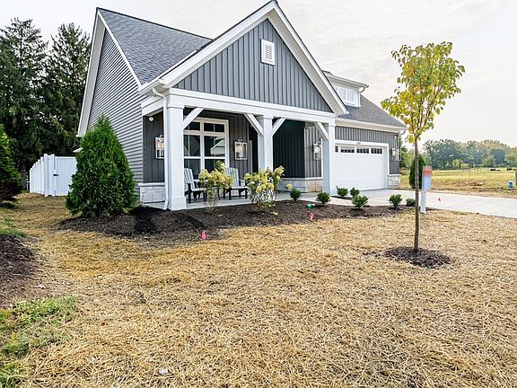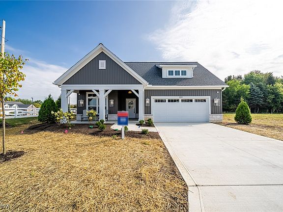 Custom Builder Model Home! This brand-new single-family ranch in Magnolia Meadows combines luxury design, exceptional craftsmanship, and a low-maintenance lifestyle in one of Lorain County’s premier communities. Enjoy a welcoming front porch, open-concept layout, and a fenced, covered courtyard with a custom 2x2 concrete patio—perfect for outdoor dining or relaxing with family and pets.Inside, the designer kitchen impresses with custom soft-close cabinetry, soapstone countertops, GE appliances, and a large center island that opens to the Great Room. Details include a brick accent pantry wall, crown molding, solid core doors, wide trim, and built-ins with shiplap. The Great Room features wall-to-wall glass sliders, flooding the home with natural light and connecting effortlessly to the courtyard.The Primary Suite showcases architectural ceiling detail, a spacious walk-in closet with custom built-ins, and a beautiful bath with dual sinks and an oversized tile shower. Additional highlights include a den with courtyard access, custom ceilings throughout, Energy Star mechanicals, a tankless hot water heater, and high-efficiency furnace and A/C.Residents of Magnolia Meadows enjoy resort-style amenities, including a clubhouse, fitness center, pool, pickleball and bocce courts, and a scenic pond with fountains and a firepit—perfect for gathering with neighbors and friends. The HOA ($295/month) covers lawn care, landscape beds, snow removal, and front walkway shoveling for truly carefree living.Ideally located near Avon, Avon Lake, Bay Village, Westlake, and Rocky River, this home offers convenient access to fine dining, golf, shopping, and Lake Erie recreation. Experience upscale, maintenance-free living in a thoughtfully designed community.