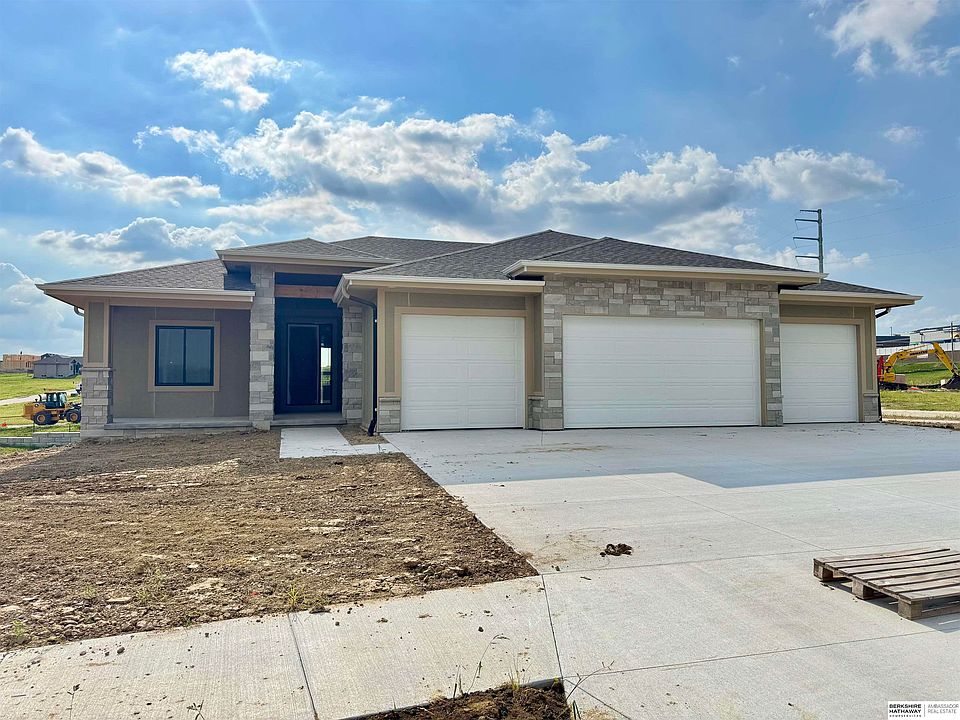 Barr Homes new Berkeley Ranch with modern elevation on a WALKOUT East-facing corner lot that backs to NO neighbors behind. Open floor plan with large windows & daylight throughout. Great room features a natural stone fireplace. Large kitchen with locally made custom cabinetry, cabinets to the ceiling, cabinet vented hood, huge center island & walk-in pantry! Primary with double sink vanity, huge walk-in shower & walk-in closet. Spacious laundry room with sink vanity, shelving, and upper cabinet. Drop area coming in from garage with bench and cubbies. Huge 4-car-wide garage. Covered composite deck on rear with covered patio below. Finished basement with 2 additional bedrooms, 3/4 bath, rec room with a wet bar and still plenty of storage/utility space. Buyer to verify current HOA fees and schools. AMA. PHOTOS MAY BE OF SIMILAR, MORE COMPLETED HOME.