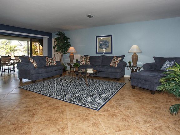 Vacation rental Weekly/Monthly. 3 BR 2 Bath single family pool home located on corner lot in the sought-after SW area of Cape Coral. Walking distance or better yet use the 2 bikes that come with the rental and bike to Cape Harbour with restaurants, shops, boating, kayaking & fishing. Rent a boat at Cape Harbour on a daily basis and cruise the Gulf. Upscale neighborhood with lovely canal homes. Electric heated pool/spa. Home faces west and gets wonderful sun on the back lanai. Newer pool heater and blower on spa for ultimate relaxation. Reserve your next vacation now!! Fully furnished vacation rental - no annual leases. PLEASE NOTE: Posted rate for property is an average figure for one-month stay. However, property can be rented nightly, w/ a min stay of 6 nights. Length of lease and # of guests also affect rate. Cleaning fee, any deposit(s), tourist tax not included in advertised rate.