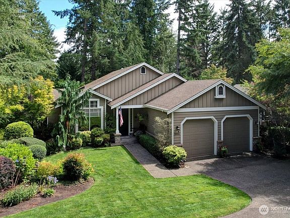 Beautifully maintained single-level home on a desirable corner lot in the gated community of Canterwood. Perfect for downsizing, part-time living, or a lock-and-go lifestyle. This 2 BR, 2.5 BA home features an open-concept living space with a spacious family room, dining area, and a kitchen outfitted with premium JennAir stainless steel appliances. The primary suite includes a brand-new shower, while the second bedroom also offers a full en-suite. Relax on the private, secluded back deck. Enjoy access to the renowned Canterwood Golf & Country Club with optional memberships for golf, dining, tennis, pickleball, swimming, and stables.