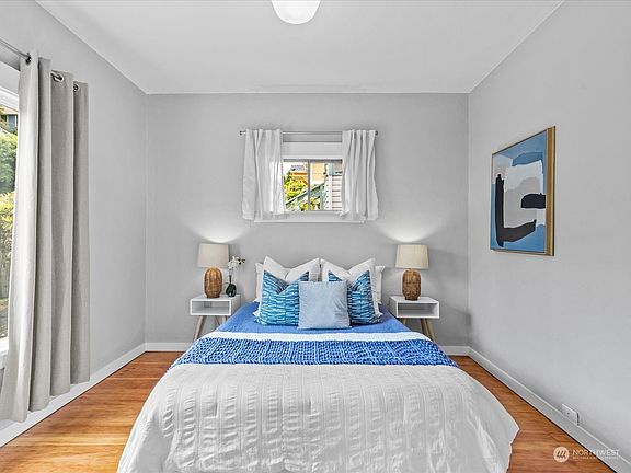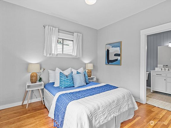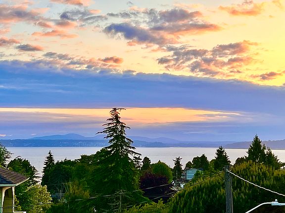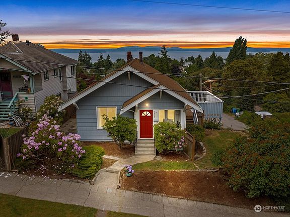 Location & View! Light-filled 1914 Craftsman enjoys un-blockable Sound & Olympic Mountain views & sunsets on a large corner lot in a quiet sought-after Seaview neighborhood, West Seattle. Embrace a walkable lifestyle blocks from eateries, shopping, Sunday Farmer's Market, local breweries & more. Main level features high ceilings, sunroom/mudroom, deck for entertaining, Primary bedroom, remodeled bathroom (double vanity & soaking tub), and charming flex room/2nd bedroom. Lower level has 2 beds plus office, laundry area (space for a 2nd bathroom) & storage. Recent upgrades include refinished old growth fir floors, new wall-to-wall carpet, fresh interior & exterior paint, and a refreshed kitchen. Go UP for More View! ADU & DADU potential here!