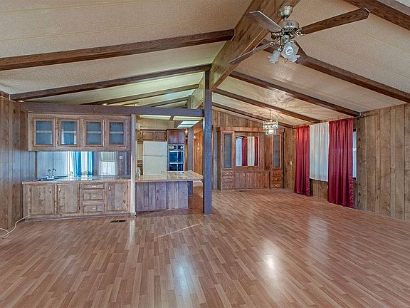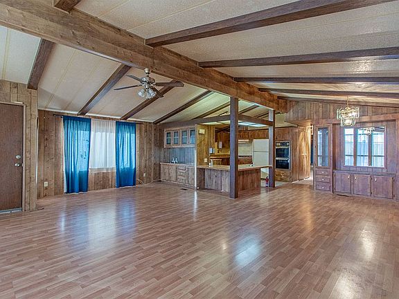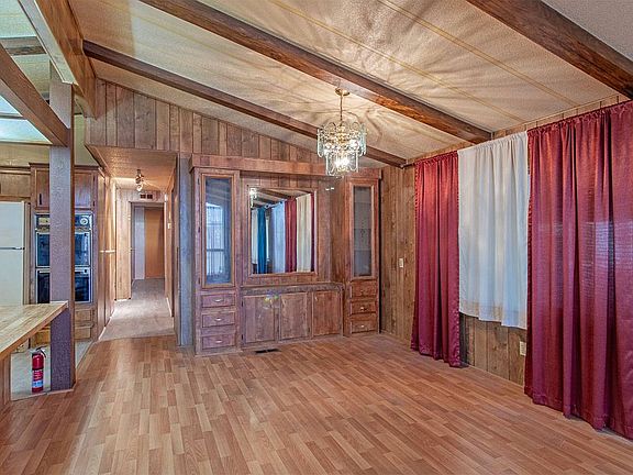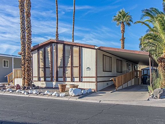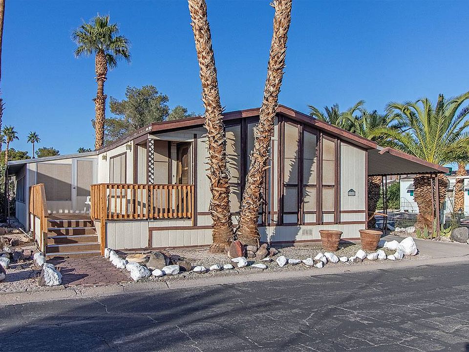 Enjoy easy living in this spacious, affordable 2-bedroom, 2-bath 24x56 mobile home located in a land lease 55+ Gated Manufactured Home Community in Las Vegas, NV. Inside, you'll love the huge open living area with vaulted ceilings, beautiful laminate floors, and a bright kitchen with a corner breakfast bar, lots of cabinets, and counter space. Both the living room and dining room have built-in hutches for storage and display. The primary suite offers a king-size layout with a large mirrored closet and private bath with a walk-in shower. The guest bedroom and connecting guest bath with walk-in shower are perfect for visitors. There's even more to enjoy-an oversized laundry room with extra cabinets and a built-in desk, plus a fully enclosed sun-room and bonus man-cave/craft room that provide extra space to relax or pursue your hobbies. This lovely home sits on a corner lot with mature trees, covered parking, and a rear ramp for easy access. It's move-in ready and priced to sell quickly, so don't wait!