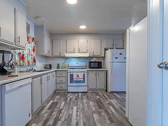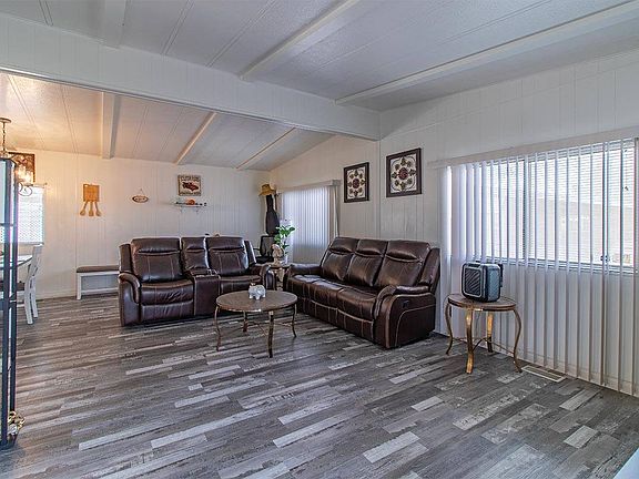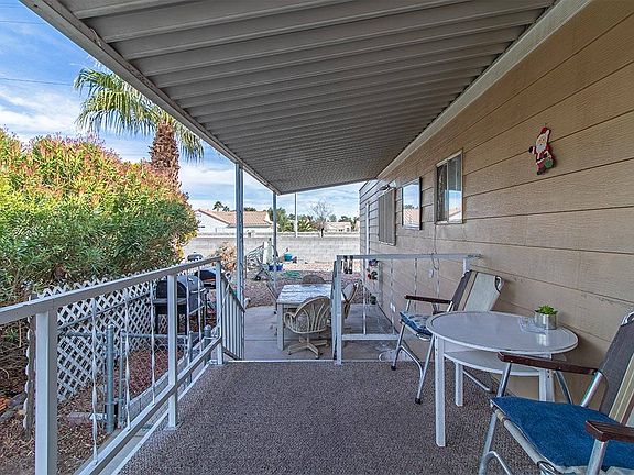 Affordably priced 2 bedroom 2 bathroom mobile home For Sale in a land lease 55+ community. This home is located on a partially fenced home site with low maintenance desert landscaping. It has a covered front deck and cement patio and on-site covered parking for for 2 vehicles under the attached carport. There are solar screens on all windows exposed to the sun and there is a shed at the end of the driveway. This home has a front living room and dining room. The dining room includes a large built-in hutch and overhead chandelier. The kitchen is quite spacious and is loaded with cabinets and has plenty of counter space. it is open on 1 end to the living room and on the other end to the dining room. The refrigerator, dishwasher and range are all included. The laundry room is conveniently located right inside the back door of the home and next to the kitchen. There are even more cabinets in the laundry room and a large folding counter opposite the washer and dryer. The existing clothes washer and dryer are also included. The guest bedroom and bathroom are on opposite sides of the hallway directly across from each other. The bedroom is queen-sized and includes a large reach-in closet with sliding doors. The guest bath includes a tub/shower combo, upgraded toilet and vanity. The master bedroom is at the rear of the home. It is king-size and also has a large reach-in closet and an en-suite bathroom with a tub/shower combo, a large vanity, an upgraded toilet and built-in linen cabinets, and a large linen closet.