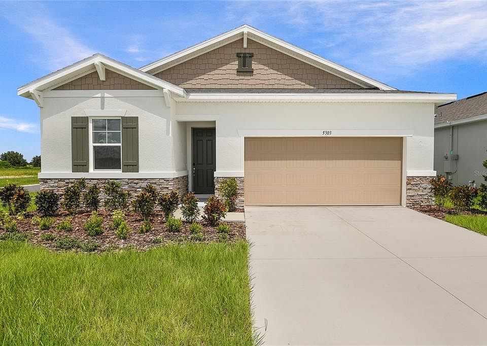 This beautiful Ruby floorplan boasts an upgraded "C" elevation with laytite stone and 8' exterior doorway. The kitchen is highlighted with preeminent quartz countertops, upgraded 42" cabinets, and a stainless GE dishwasher, microwave, and stovetop. Contemporary 7"x22" wood grain tile adorns the entry way, great room, kitchen, and bathrooms! You'll enjoy Florida living at its finest with double sliding doors that open to a covered lanai. Smart thermostat, deadbolt, garage opener, and video doorbell highlight this chic slate plan you're sure to love! **Options may vary by community, so see your sales associate for details. These offers are available for select homes on a first-come, first-served basis.