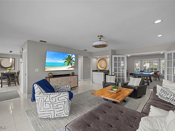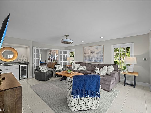 With over 100 feet of sparkling water frontage, the property showcases breathtaking panoramic views of intersecting canals. Inside, the home offers over 2,600 square feet of well-designed living space featuring four spacious bedrooms, a versatile den, and two and a half baths. The layout includes a formal living room, a family or game room, and a bright eat-in kitchen with a breakfast bar that flows well for everyday living or entertaining. The recently upgraded kitchen is a chef’s delight with sleek European-style cabinetry, granite countertops, and stainless steel appliances. A wet bar with a wine cooler adds a touch of sophistication ideal for gatherings.
