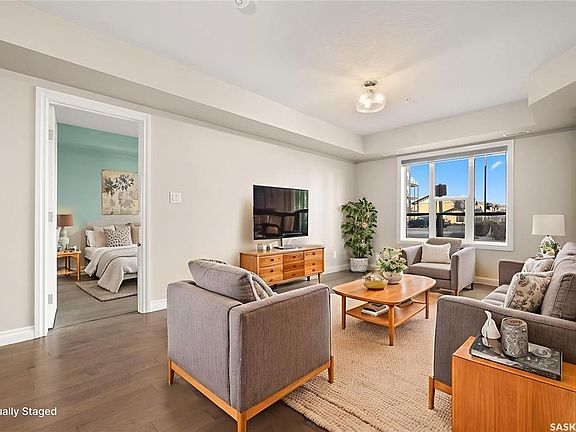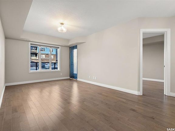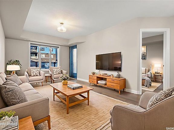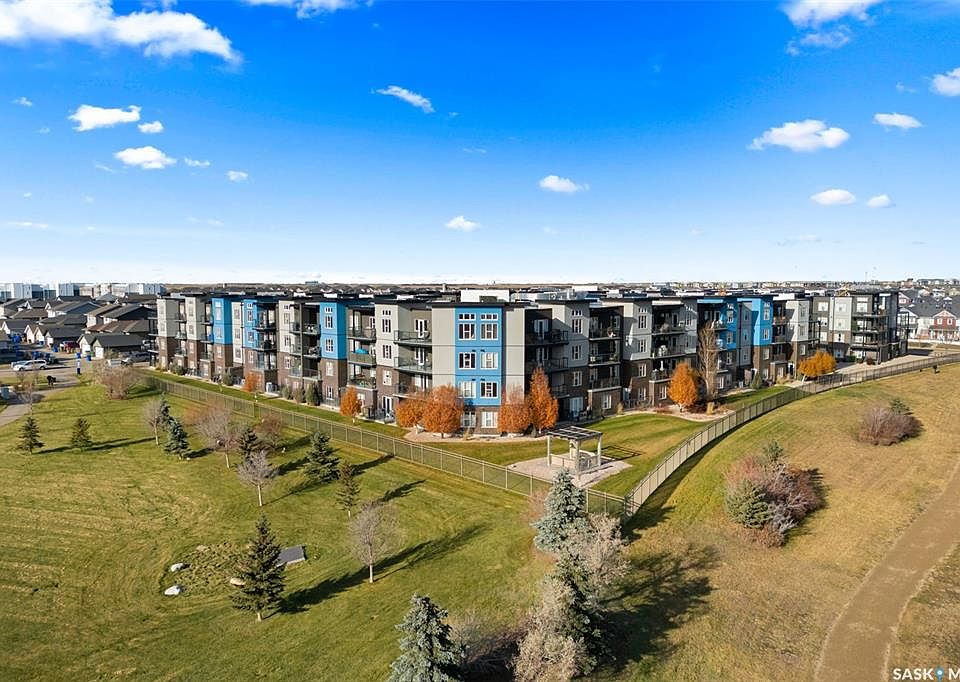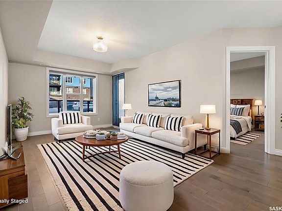 Welcome to Unit #103 at 5303 Universal Crescent, located in the highly desirable Harbour Landing community in Regina's south end — a luxury-style condo living experience that blends comfort, convenience and impression. Step into this modern, thoughtfully designed 2-bedroom, 2-bathroom home in the iconic Fontaine Bleu building (built 2013) and enjoy over 1,000 sq ft of open-concept space. This main floor unit, features hardwood floors + ceramic tile throughout, wide windows bringing in natural light and a seamless flow from the kitchen into the dining and lounge area. The kitchen is a standout — generous counter space, an eat-up island, and a large walk-in pantry provide plenty of storage and functionality for both everyday meals and entertaining. Each bedroom includes a walk-in or walk-through closet, and the primary suite features its own full 4 pc ensuite bath for added privacy. A second full bath serves the main living space and second bedroom (ideal as a guest room or home office). In-suite laundry and underground parking bring added convenience. Additional comforts include central air-conditioning, natural gas BBQ hookup on the balcony (perfect for summer evenings), and condo fees that cover heat, water, sewer, snow removal and more — meaning fewer maintenance worries for you. Don't forget about the gym and theatre room!! Beyond your front door, the location truly shines. Harbour Landing offers walking paths, nearby parks, shopping and dining options within easy reach — a lifestyle of ease just minutes from home. Whether you’re a downsizer seeking low-maintenance luxury, a professional looking for style and convenience, or an investor drawn to strong rental potential, this condo delivers. Don’t miss the opportunity to call #103 5303 Universal Cres your new address — schedule a showing today.