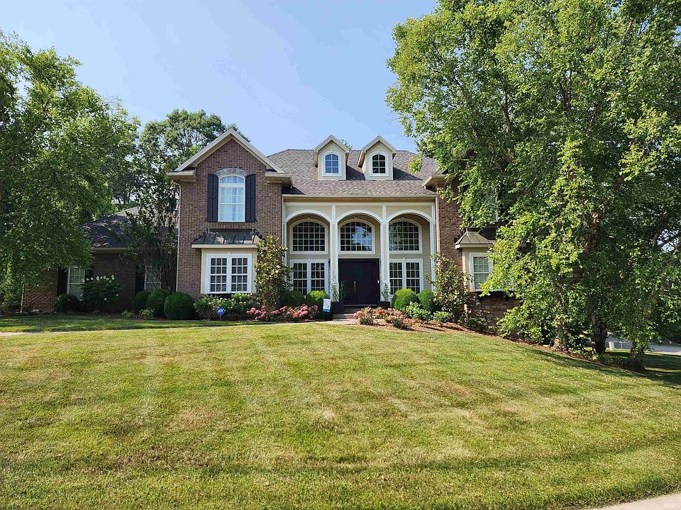 This extraordinary and distinguished custom built home with a 3 car attached garage has been meticulously maintained and is situated on a gorgeous large corner lot with lots of mature trees and remarkable landscaping that offers privacy in the prestigious Newburgh neighborhood known as Copper Creek Subdivision that offers a beautiful community lake with sidewalks throughout for outdoor enjoyment. There is an incredible amount of living space with 5 generously sized bedrooms, 4 full baths and 2 half baths, a fully finished walkout basement complete with a unique and spacious home theater with 5 reclining theater chairs. As you walk in the front door you are welcomed by an impressive soaring 2-story foyer lined with arched windows. On the main floor you will find a large office, great room with a fireplace, a remarkable kitchen with quality Fehrenbacher cabinetry, a breakfast bar, dining nook and a wine bar that leads to the formal dining room. This home continues to impress as you will see the large master suite located on the main level that features a 9 x 8 walk-in closet, a 15 X 10 private bath with a double vanity, a seperate over-sized tub and a tiled walk-in shower. As you go upstairs you will find that the second level is just as incredible as the main level boasting 3 more generously sized bedrooms and a bonus room. The second bedroom gets special mention because it has a nice sitting room, ensuite bath and walk-in closet. As you go to the lower level/basement of the house there is a huge rec room with a wet bar, an exercise room with an attached hobby room, a 5th bedroom with a walk-in closet, a full bath and the home theater. Off of the kitchen you walk out onto a nice sized private covered patio with a mounted TV. Just a few feet away there is a fabulous large in-ground heated saltwater pool for your enjoyment. There is also a half bath outside close by the pool. There is a storm shelter that offers ample space that could be used to store pool, patio and various misc. items if need be. There is Radon Gas Monitoring System. Some improvements to mention are: a Kohler Standby Home Generator System installed 1/2023, updated the Projector In Home Theater to a 4K and installed a 120 inch screen in 2022 and new Custom Brand Group, faux wood, winter white blinds, throughout!