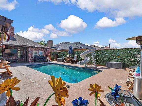 Sparkling poolOutdoor kitchenBackyard oasisLow-maintenance landscapingUpgraded countertopsTwirly slideStriking ceiling beams