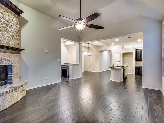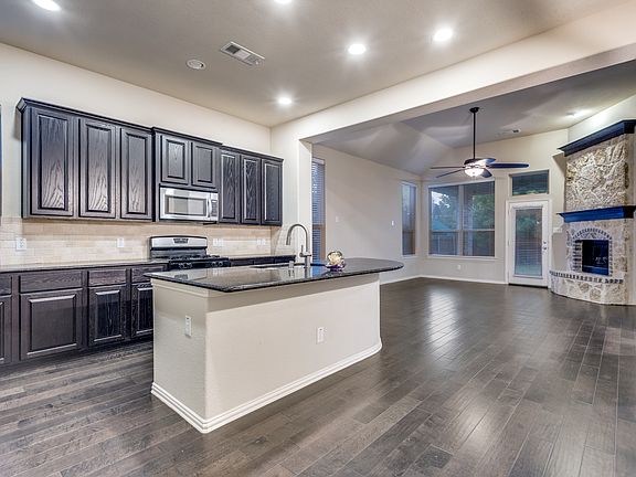 Stone fireplaceStainless steel appliancesCovered back patioIsland kitchen