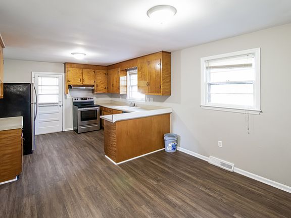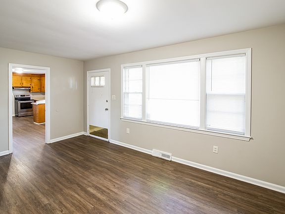 Inside, fresh interior paint and hardwood flooring give the home a clean, updated look. The main living area opens up with generous natural light from wide front windows, offering a seamless flow into the dining space and kitchen. The kitchen features stainless steel appliances, wood cabinetry, and plenty of counter space, providing both functionality and charm.