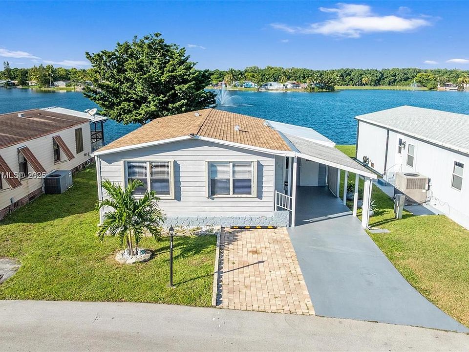 Cozy mobile home featuring 3 bedrooms and 2 bathrooms with a beautiful lake view. The property offers a new roof (2024) with a 7-year warranty, central A/C (2023), and washer and dryer included. The enclosed patio with acrylic panels is perfect for enjoying the scenery year-round. The closets in the second and third bedrooms have been remodeled, as well as the second bathroom. The association fee is only $900 per month, covering three community pools, exterior lawn maintenance, trash collection, and 24/7 security. The home also provides parking space for up to three vehicles